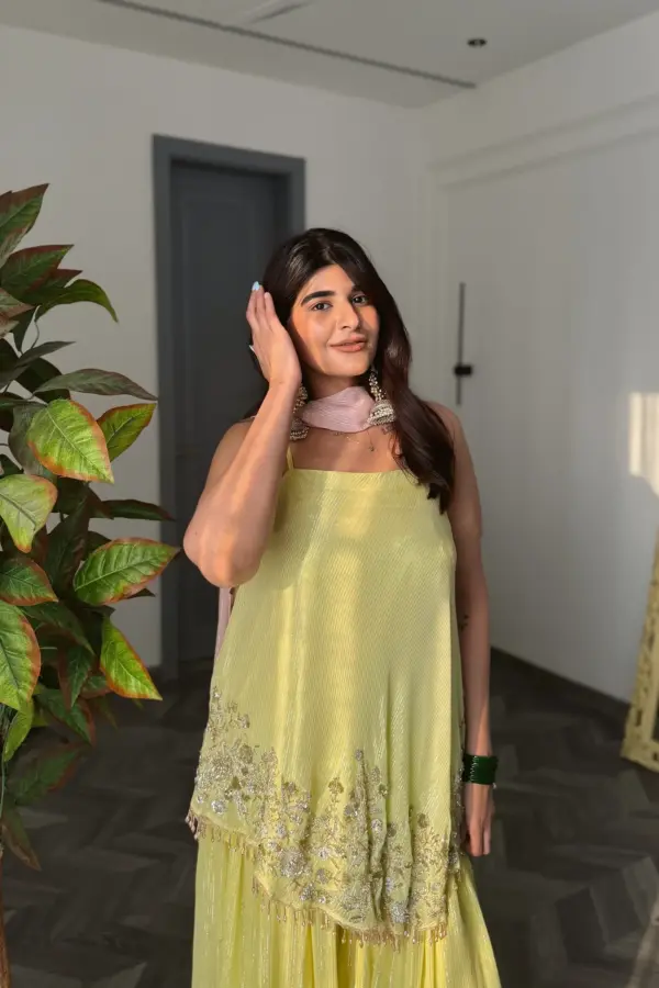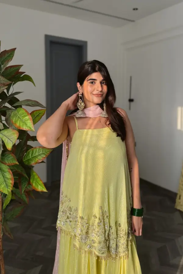 yellow glass crystals, sequin and zardosi embellished tang top, flared pallazo and a baby pink dupatta