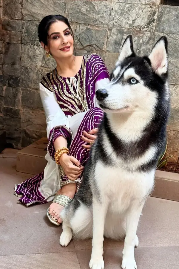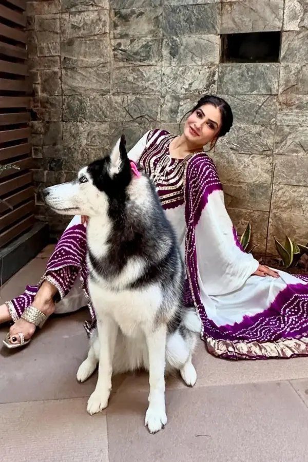 Divya Chawla in our Red and electric blue embellished bandhani kaftan and red silk pants set