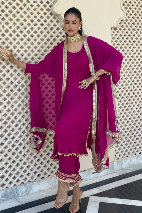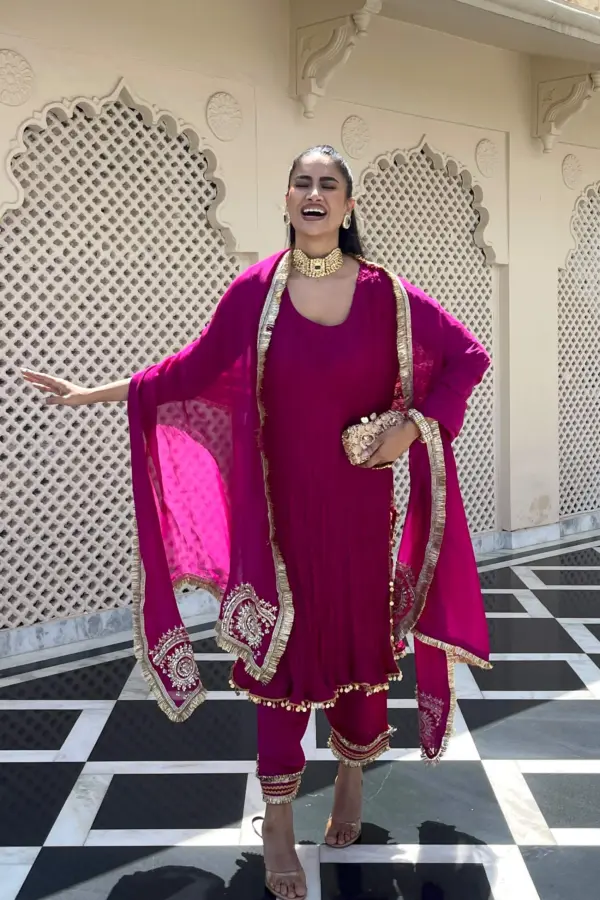 Alisha Pekha in a majenta textured silk anarkali , salwar pants and a heavily embellished dupatta set