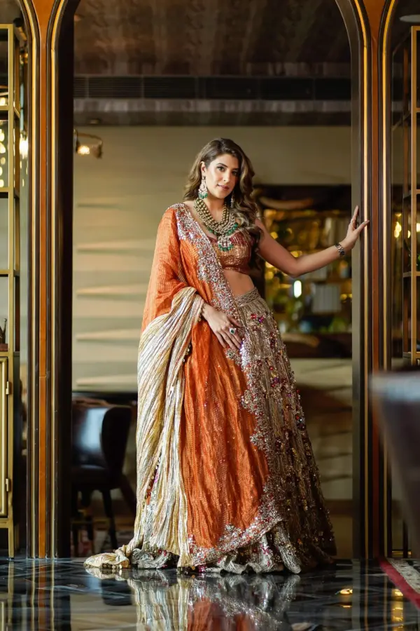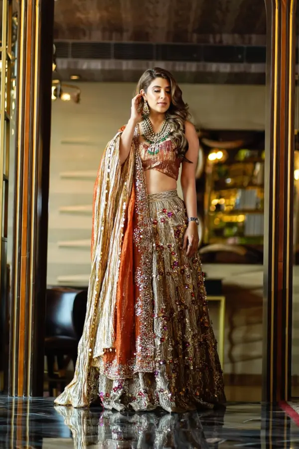 Anjali Khushalani in an intricate crochet 3d emebllished lehenga, textured metallic bustier and a mirror embellished tissue and metallic dupatta