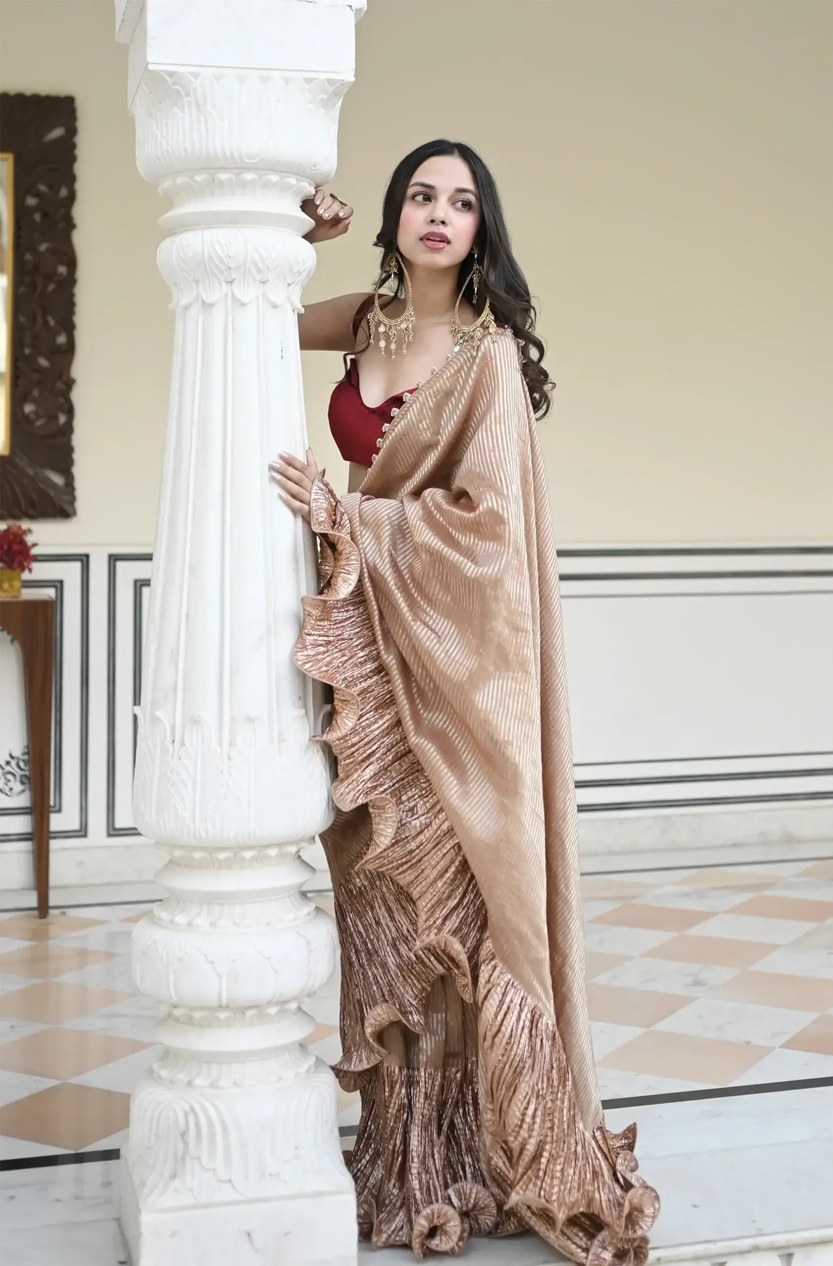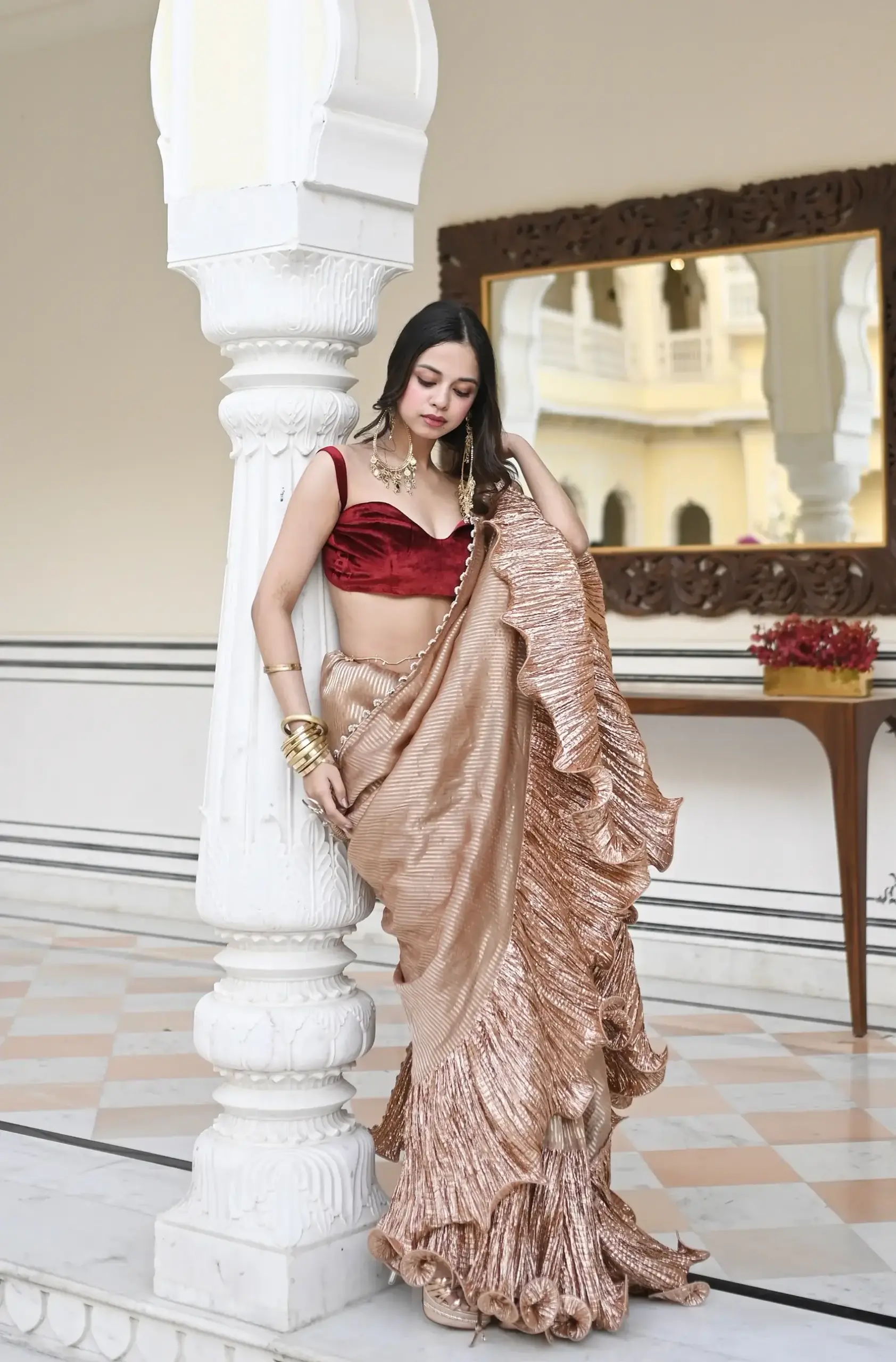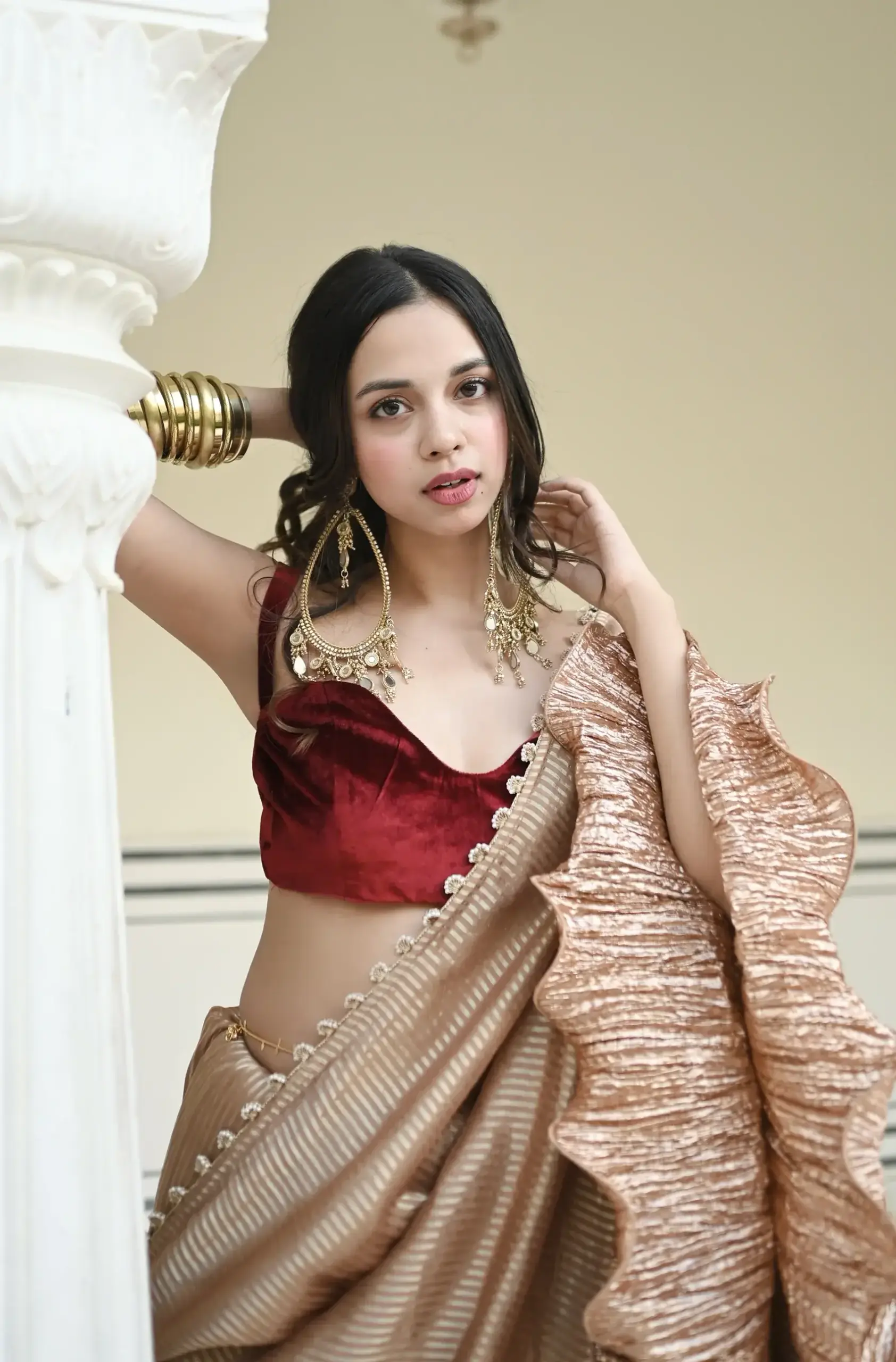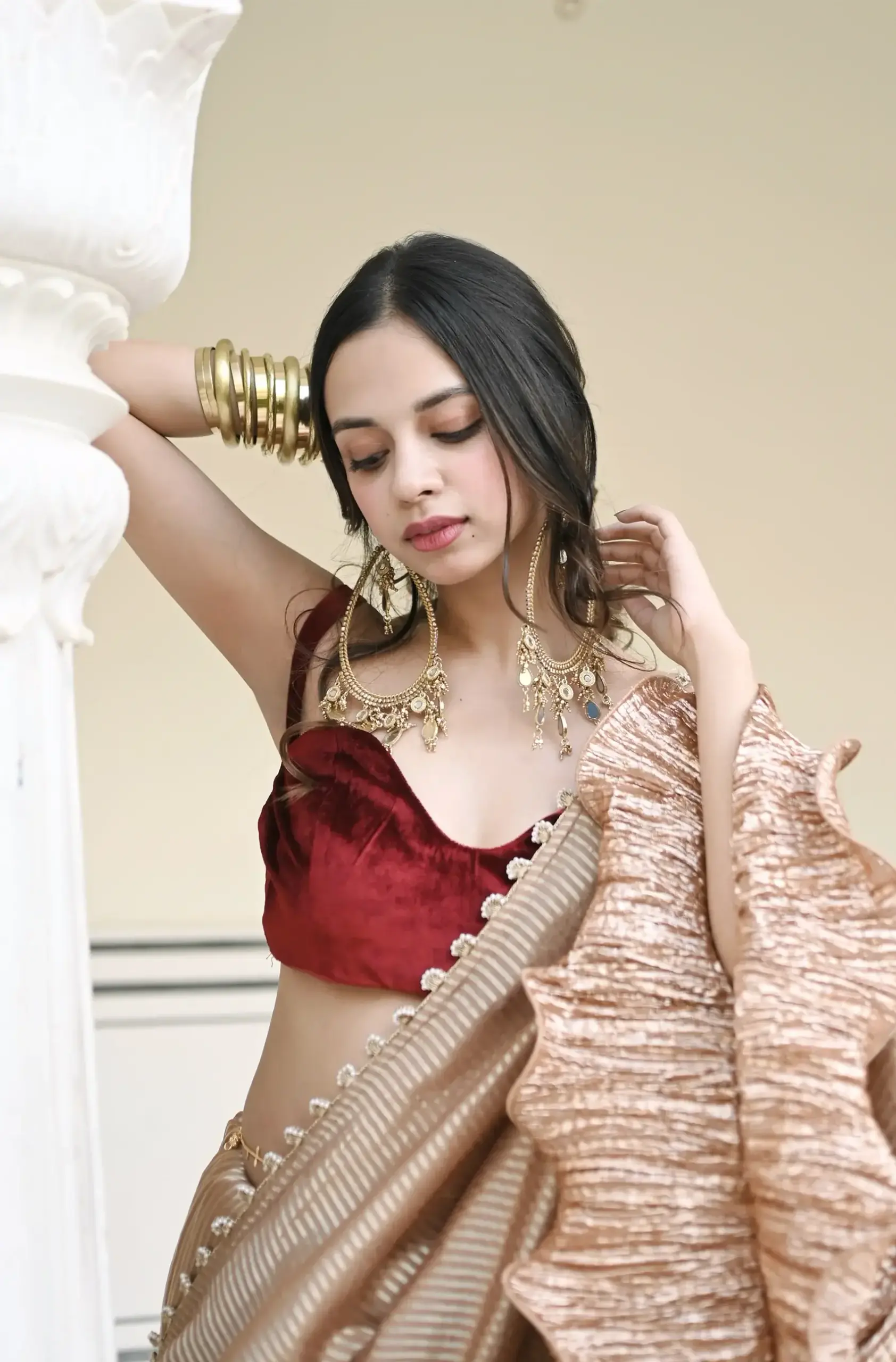 champagne striped tissue saree witth the champagne textured metallic statement detail and a maroon velvet blouse quantity