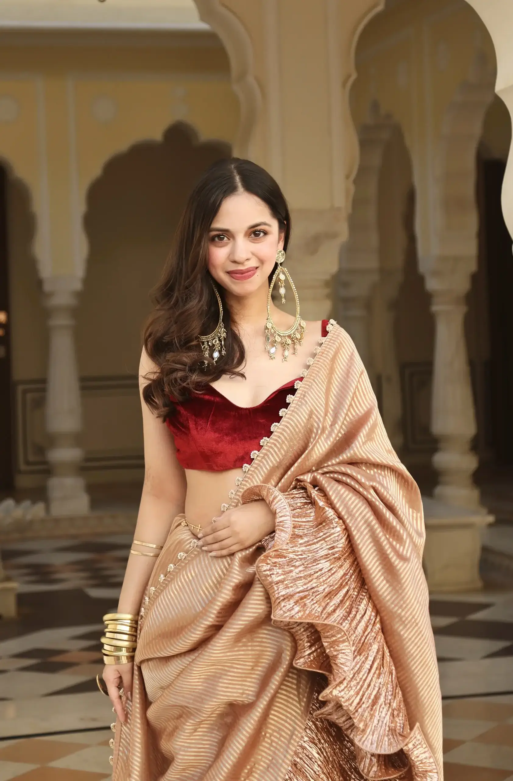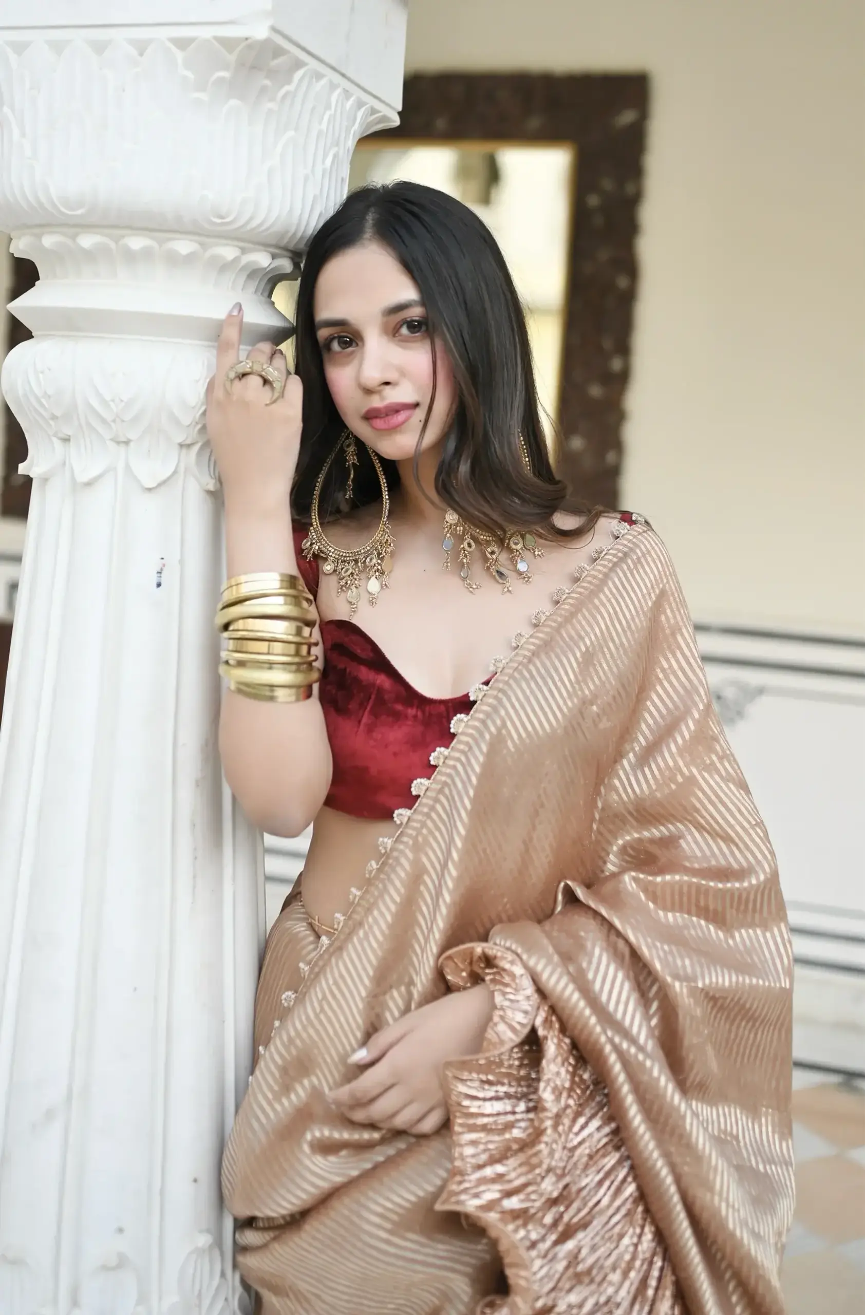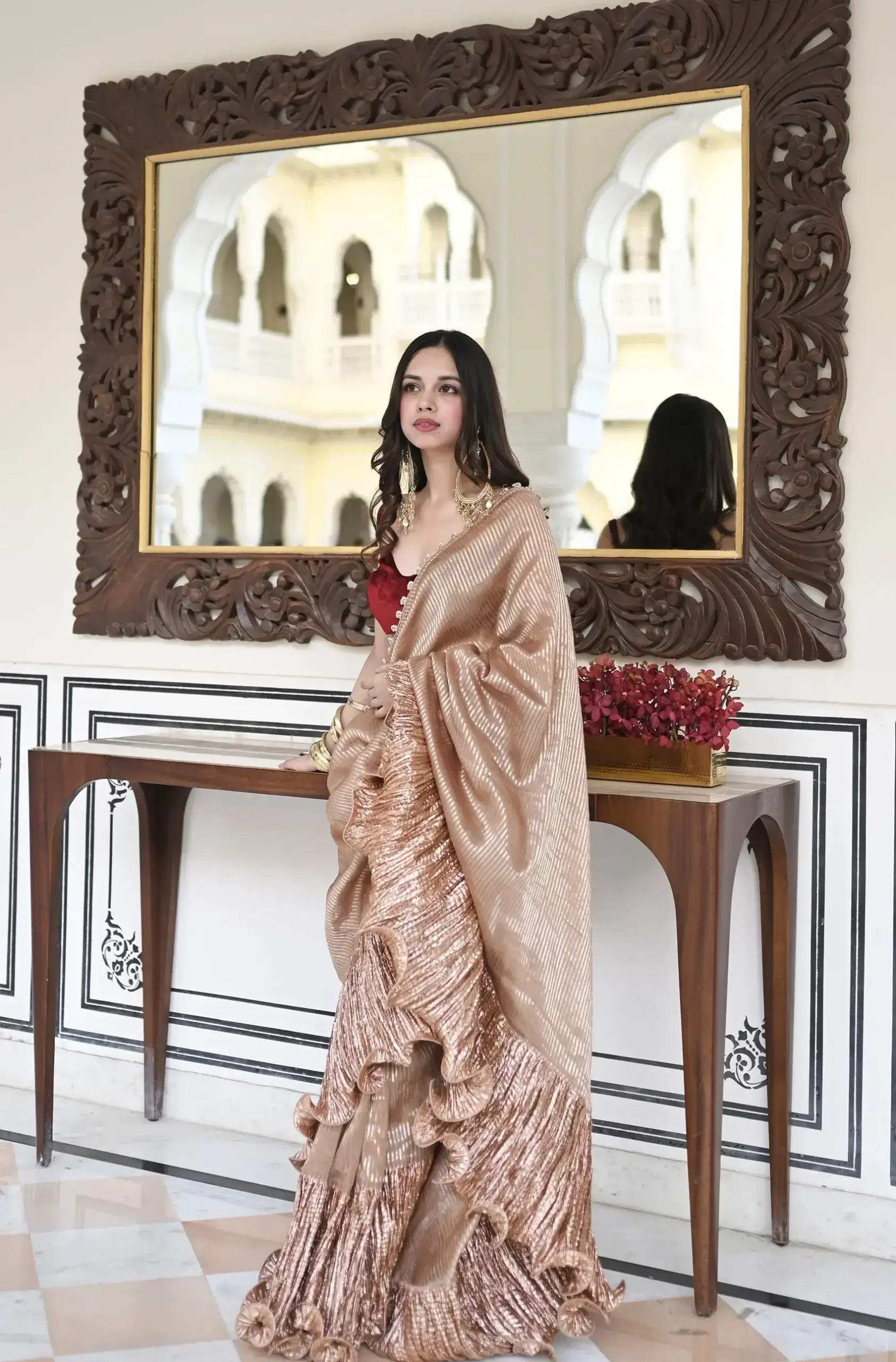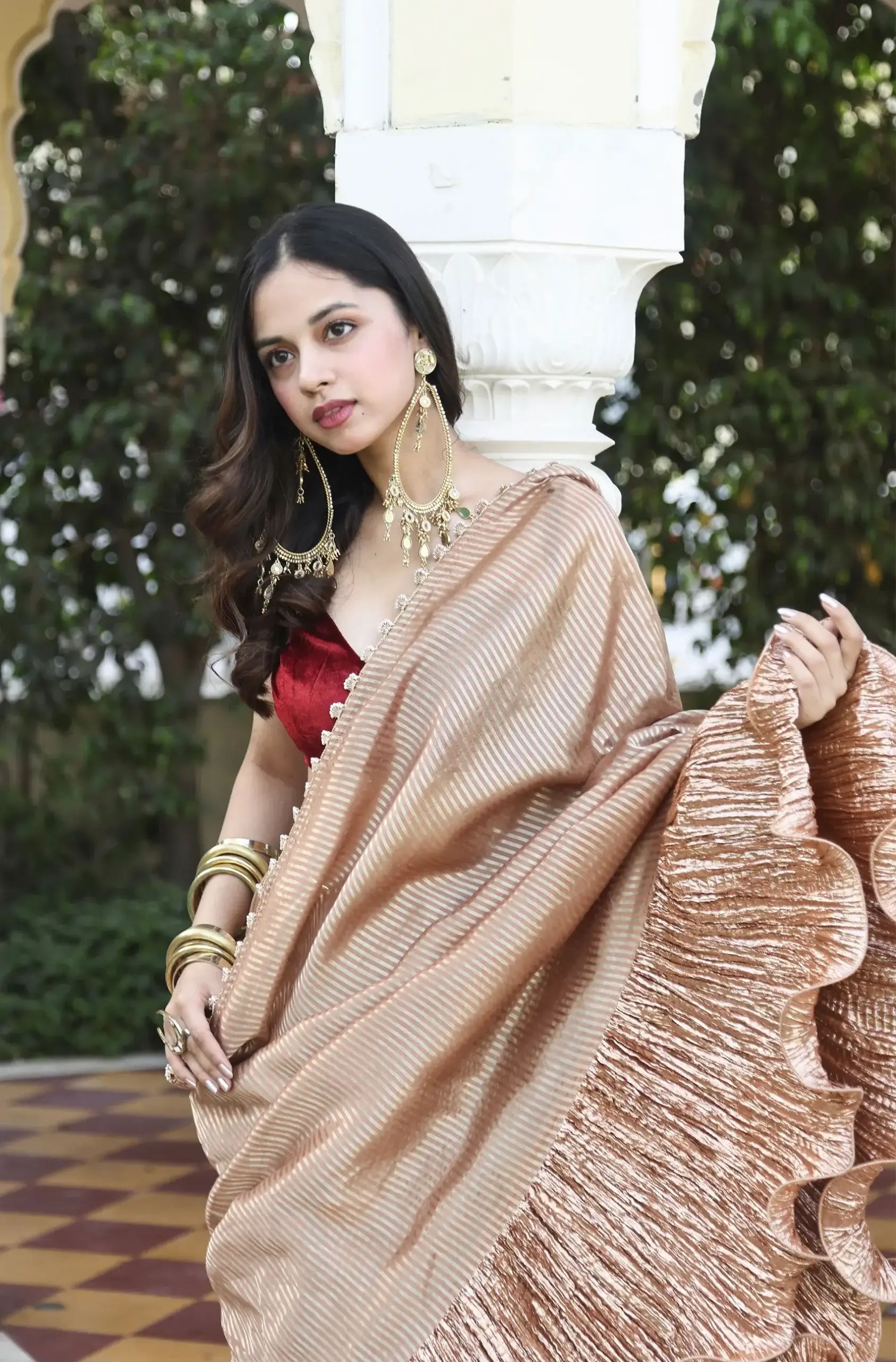 champagne striped tissue saree witth the champagne textured metallic statement detail and a maroon velvet blouse quantity