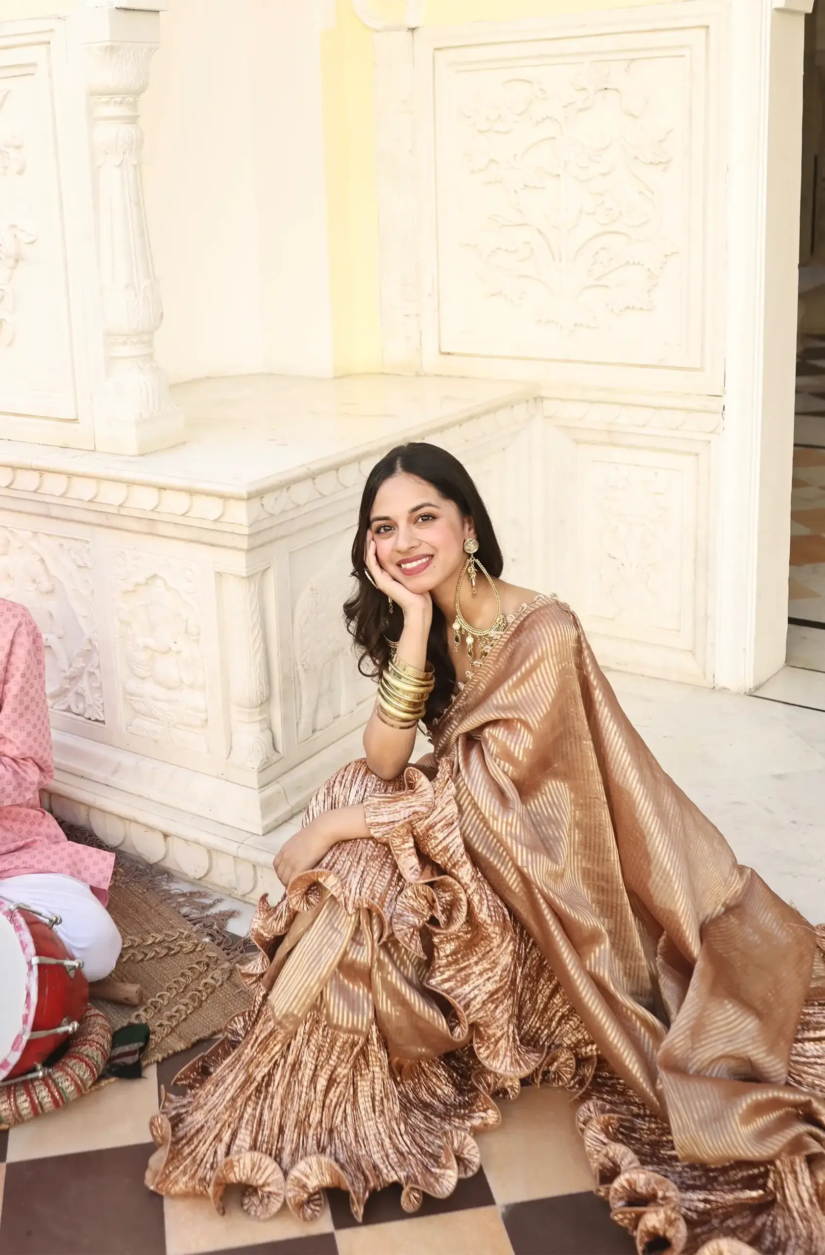 Diipa Khosla in Pink Metallic Textured Lehenga Saree Set