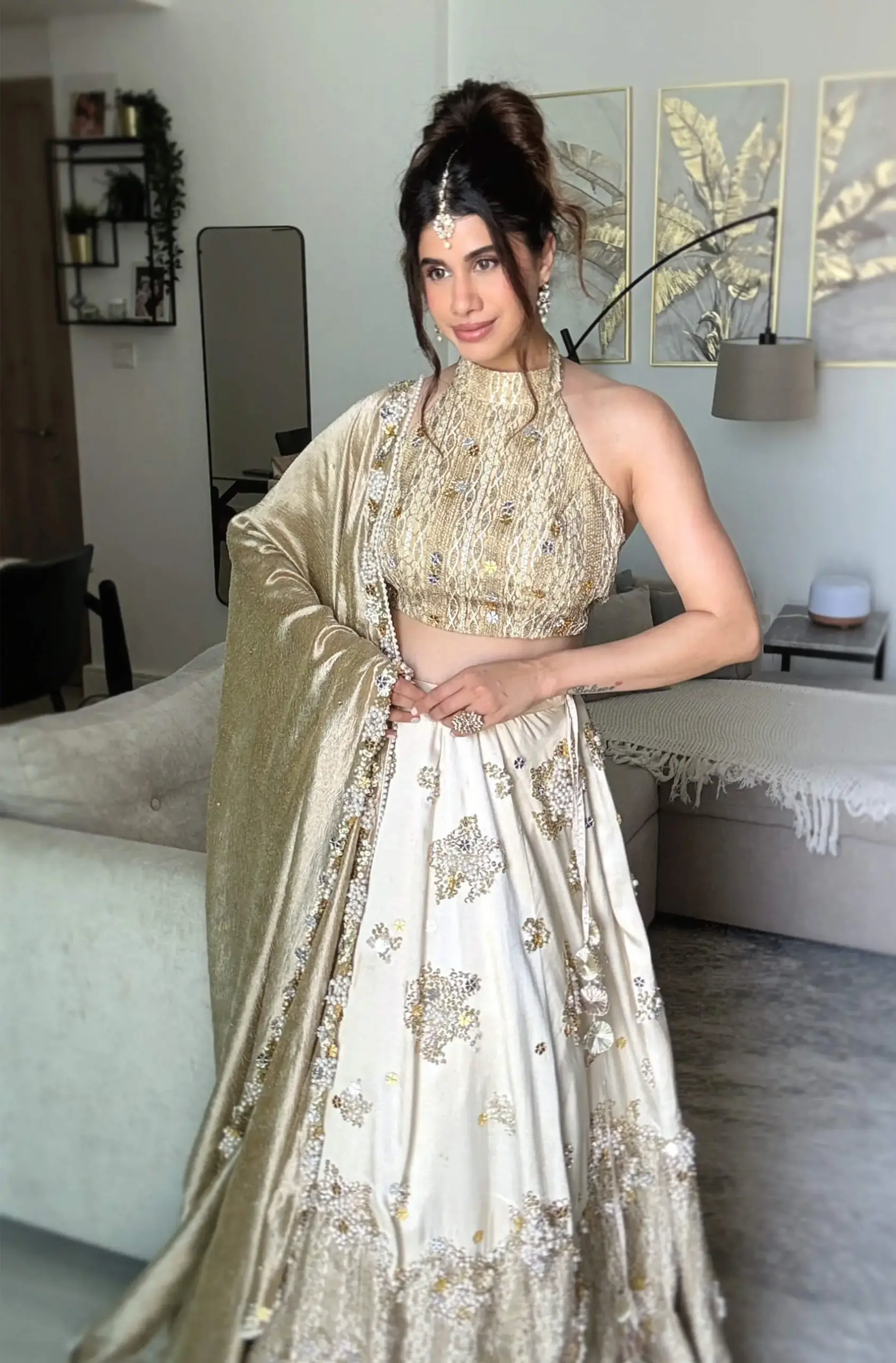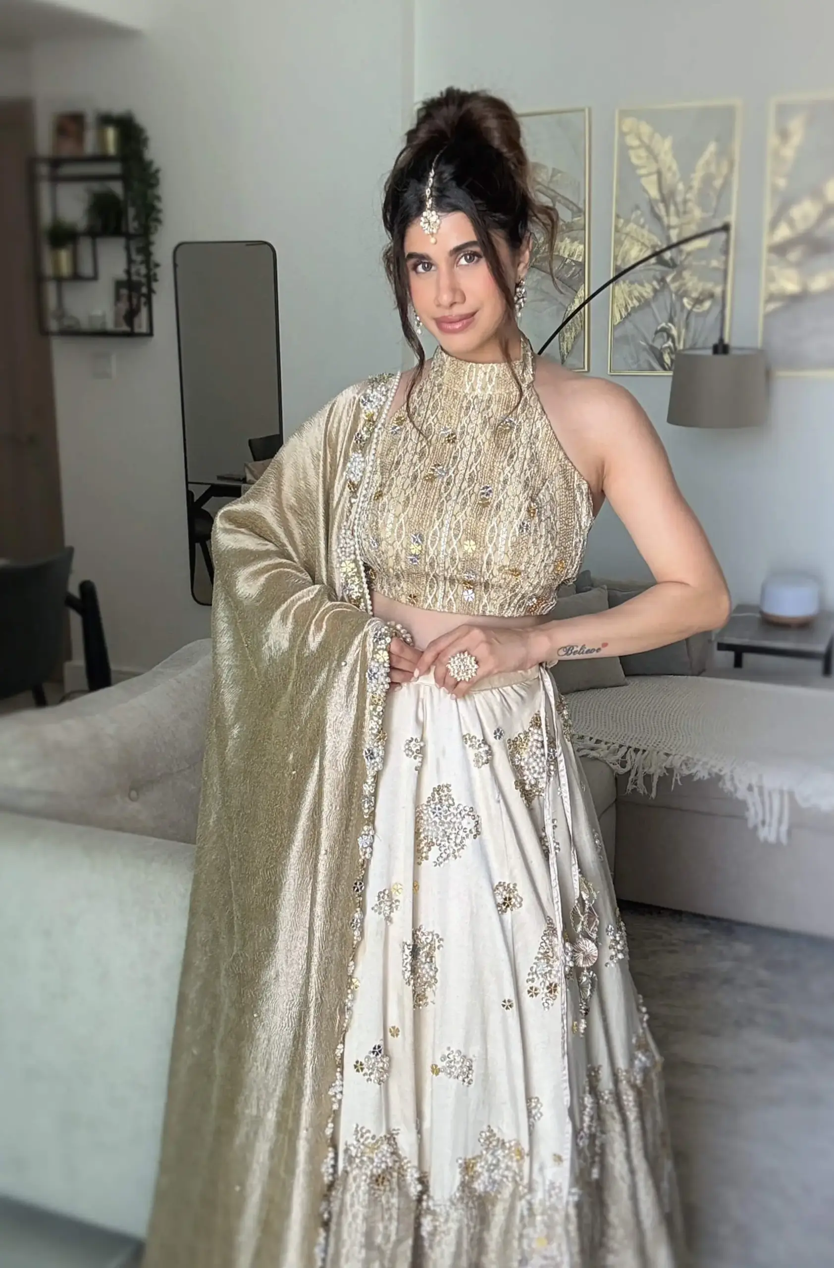 Meghna Sahijwani in gold and rose gold metallic lehenga