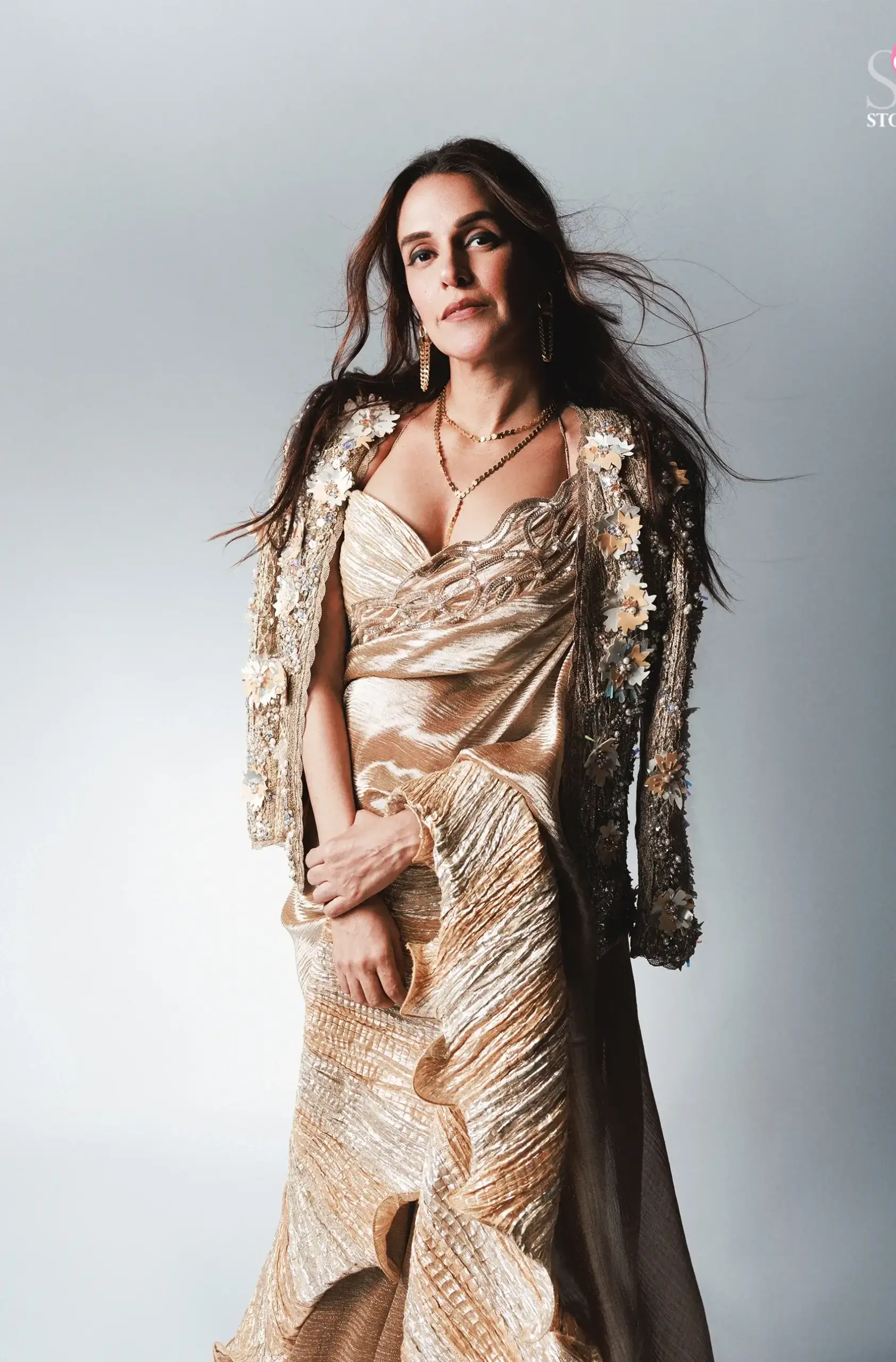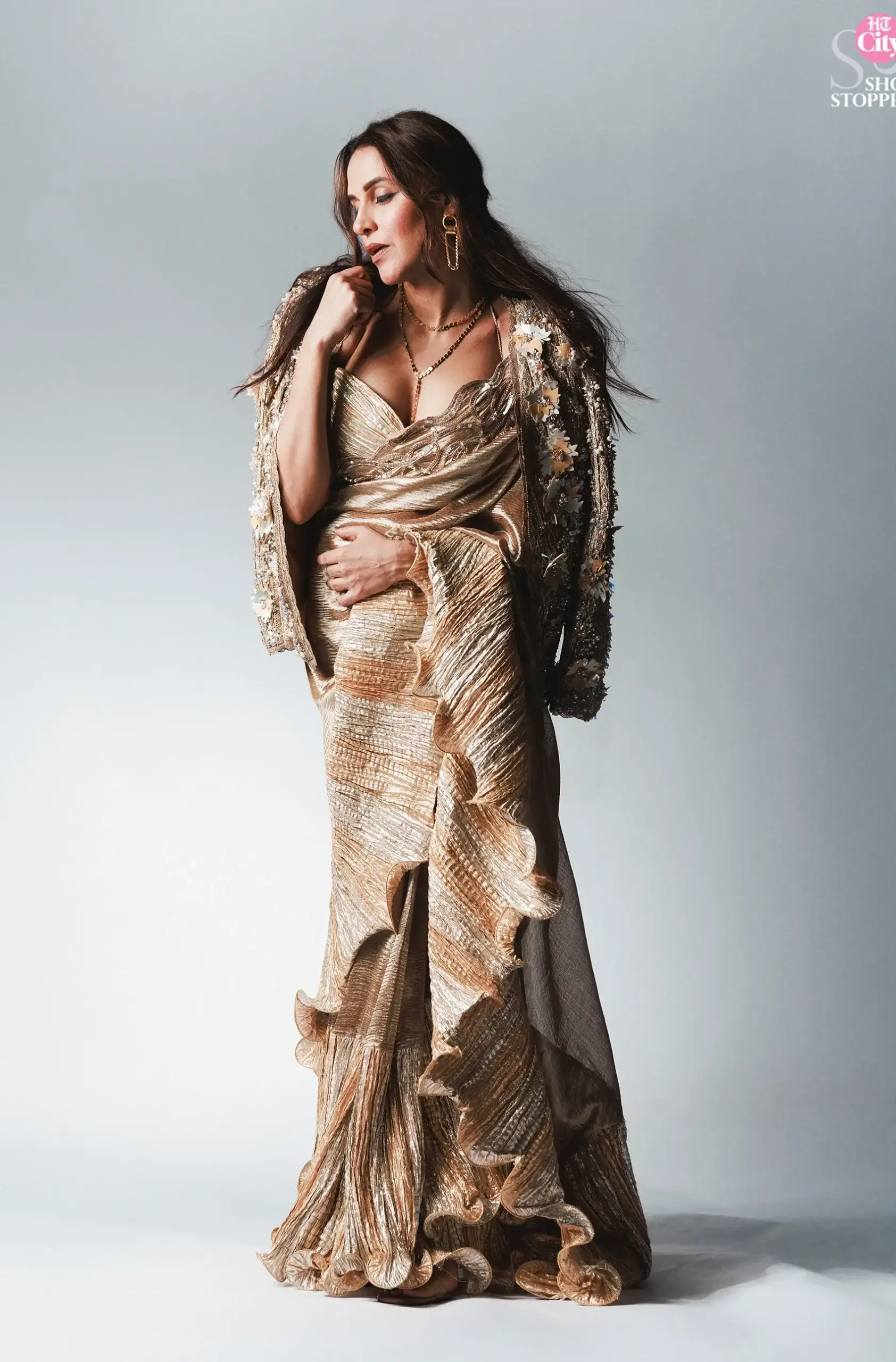 / Ivory tissue embellished saree, textured metallic bustier and a heavily crystal and pearls embellished blazer set