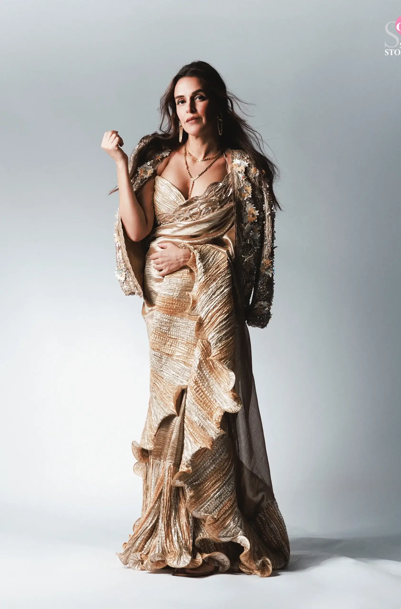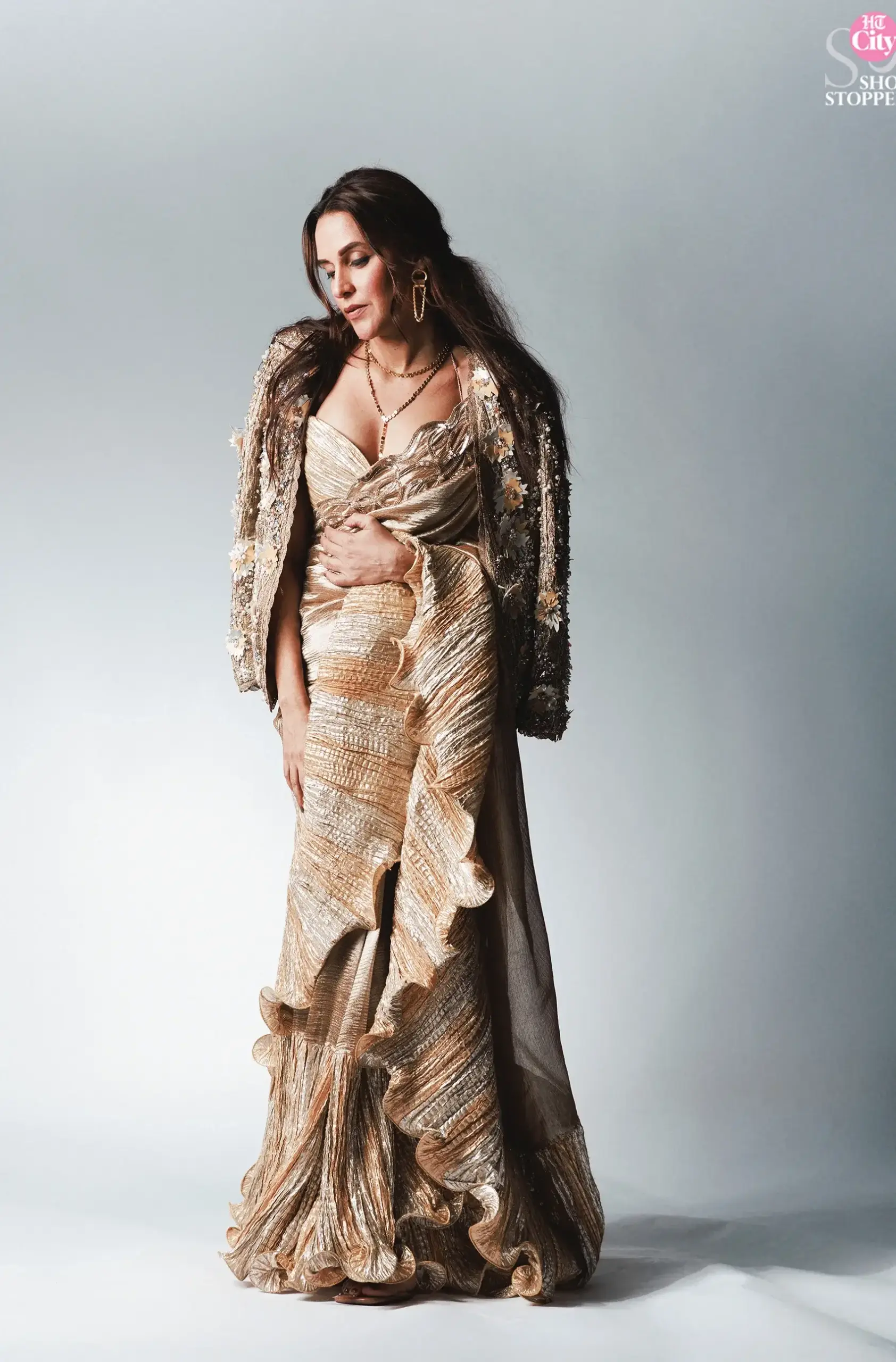 Ivory tissue embellished saree, textured metallic bustier and a heavily crystal and pearls embellished blazer set quantity