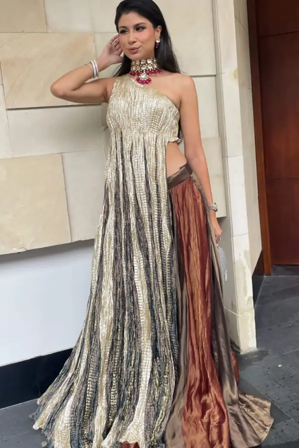 Roshni daswani – The metallic one shoulder flared anarkali with a rust and coffee tissue lehenga