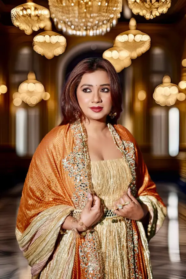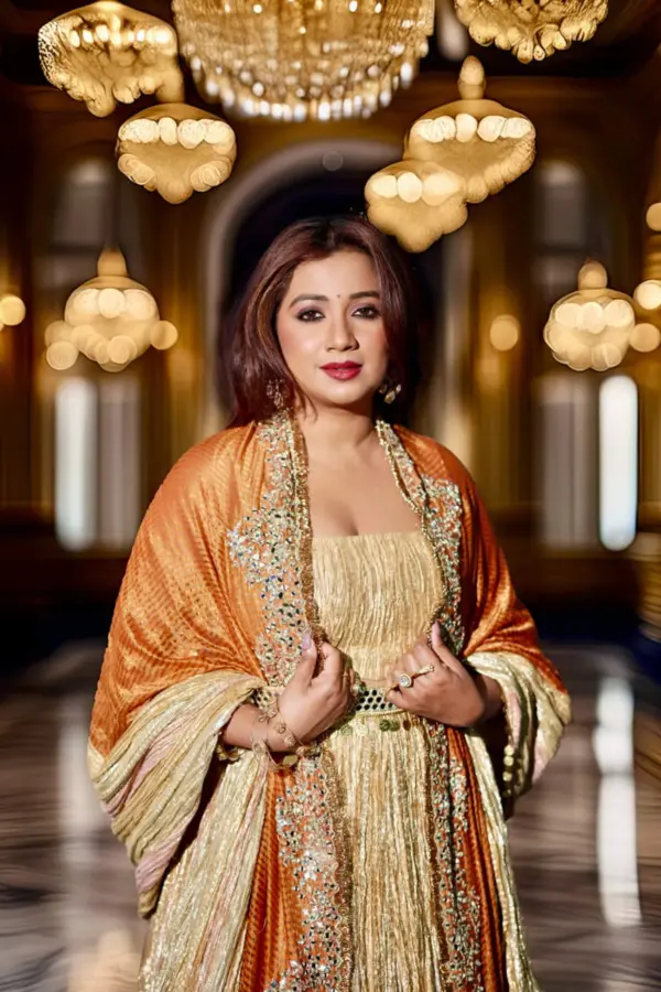 Shreya goshal in gold textured metallic flared lehenga , corset and a mirror embellished orange and metallic dupatta