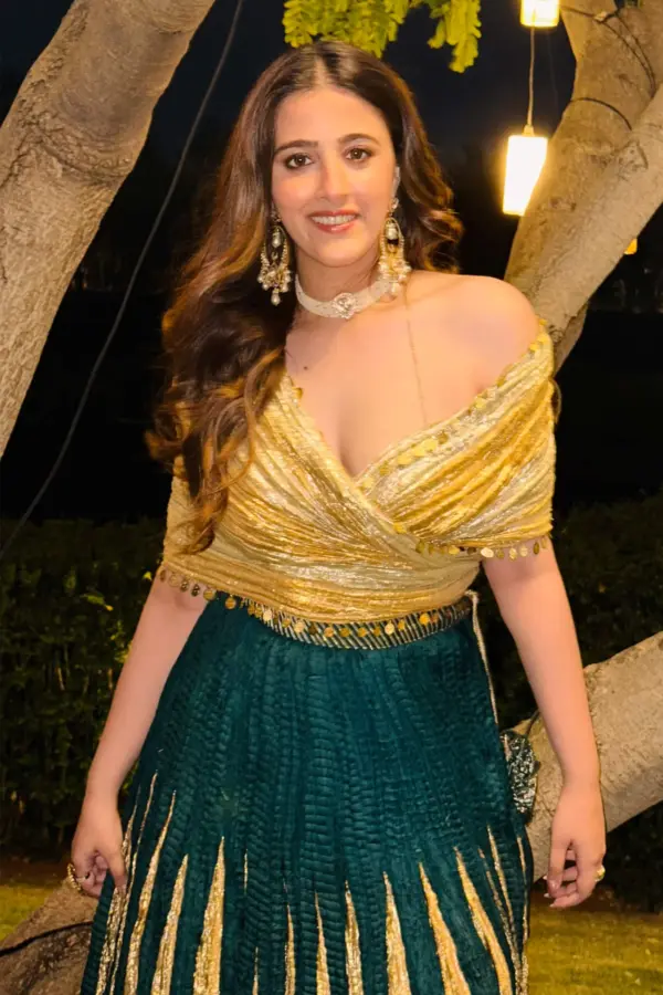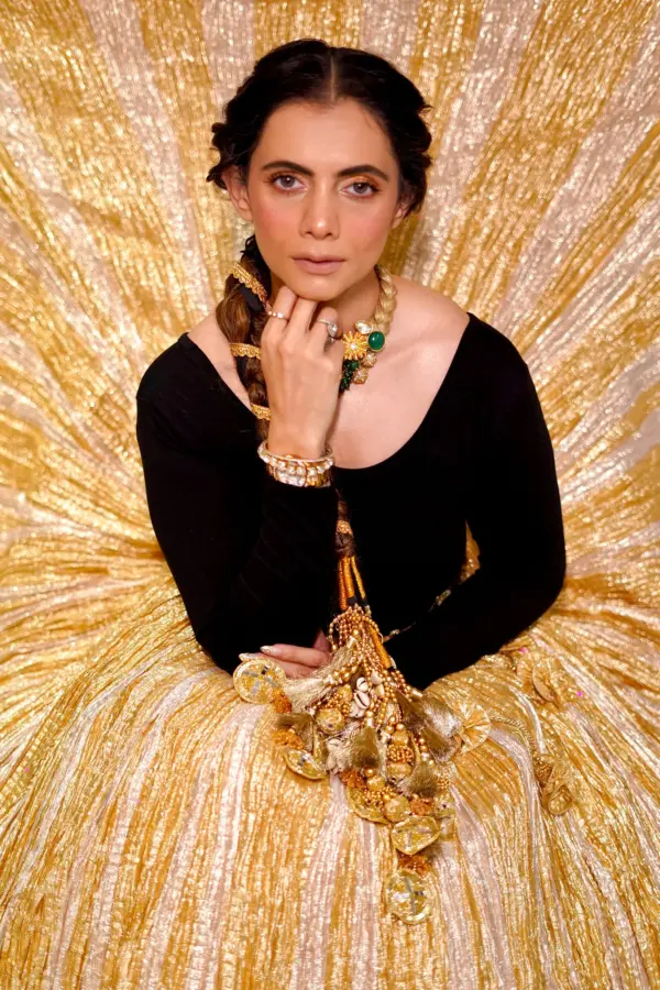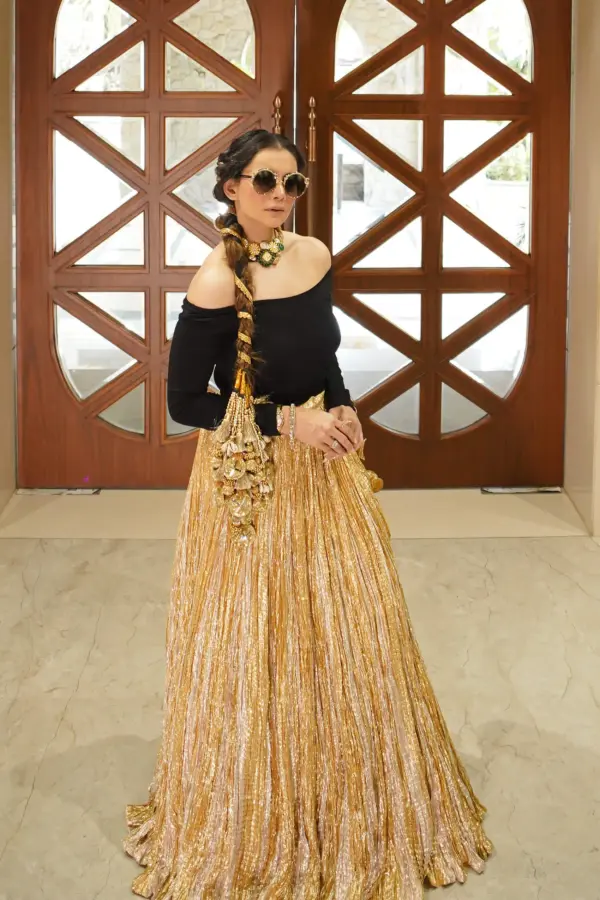 Tanya Kapoor in a textured metallic gold lehenga with a black knitted blouse