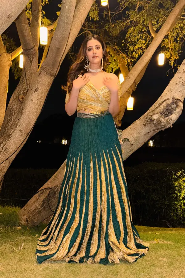 Nupur sanon in a bottle green and gold textured metallic lehenga and a drape wrap around blouse