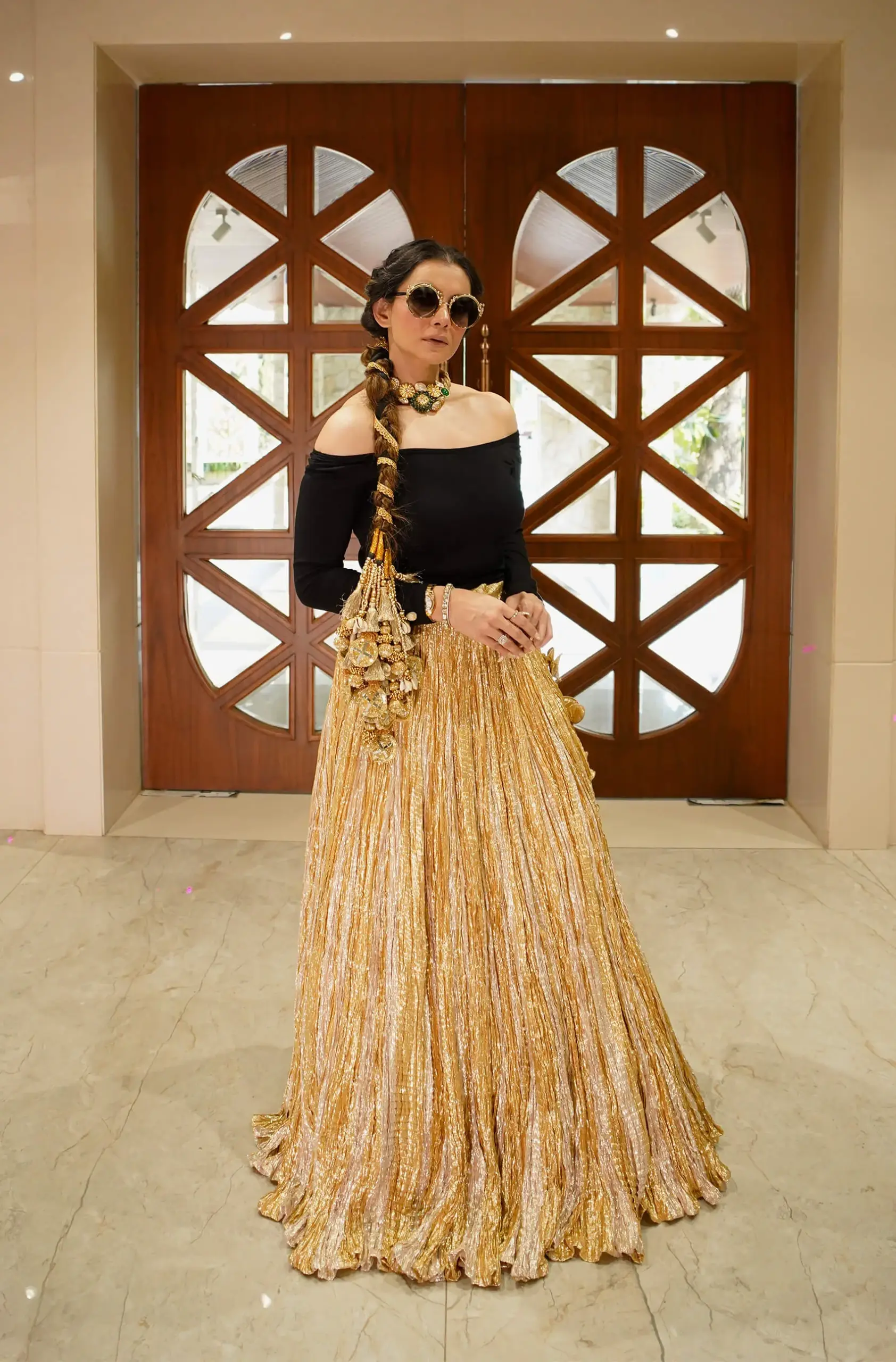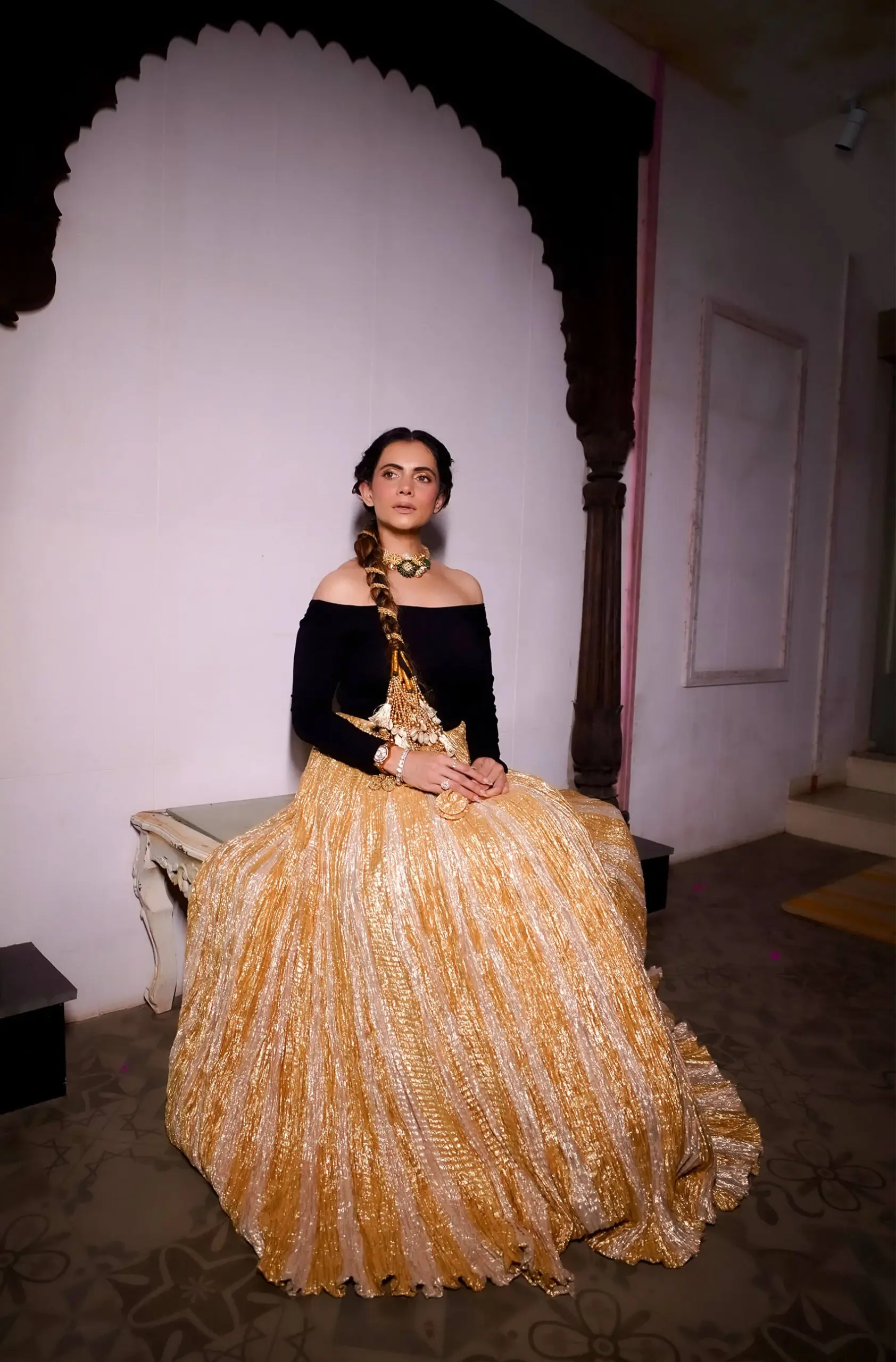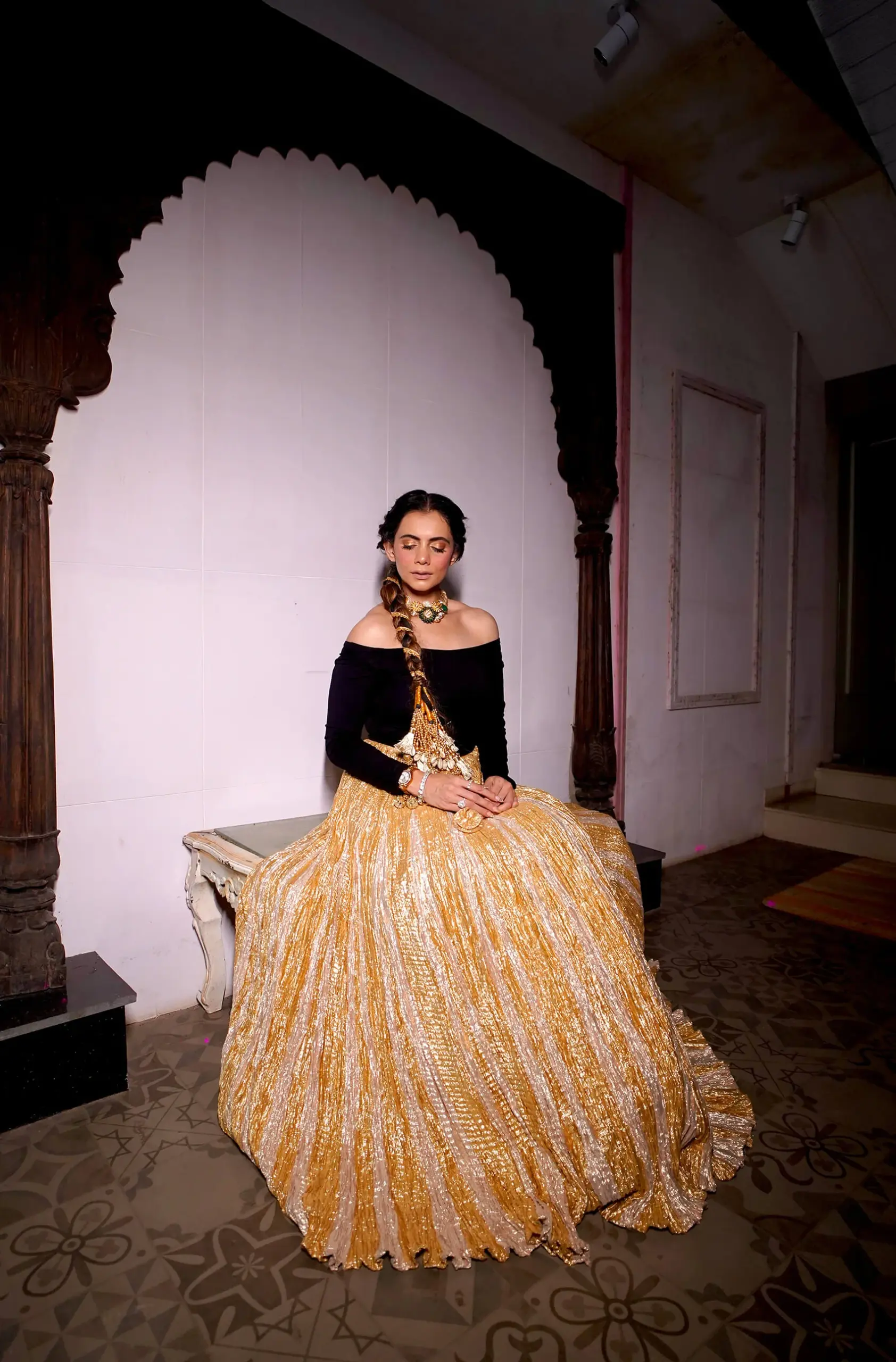 / Tanya Kapoor in a textured metallic gold lehenga with a black knitted blouse