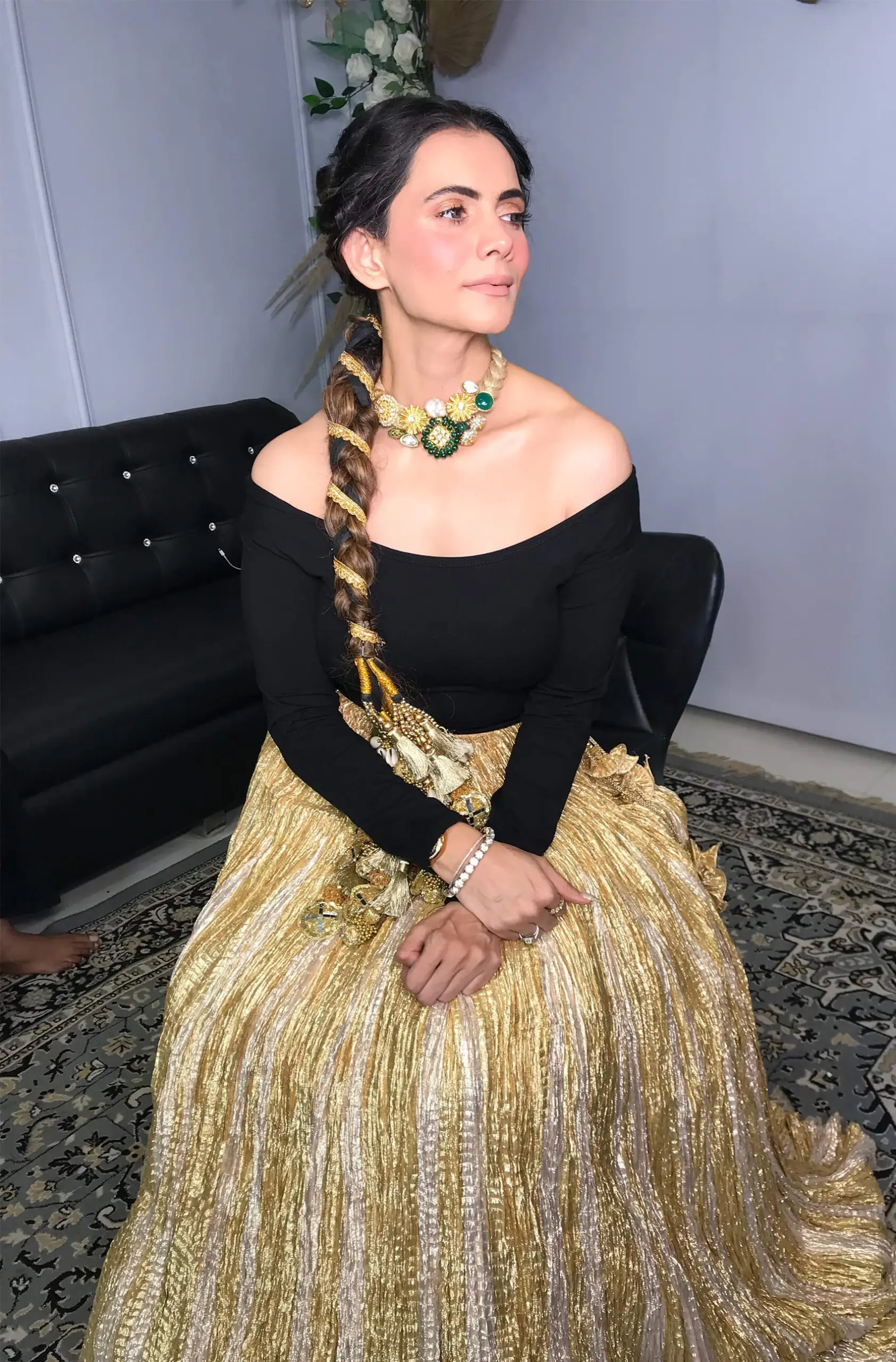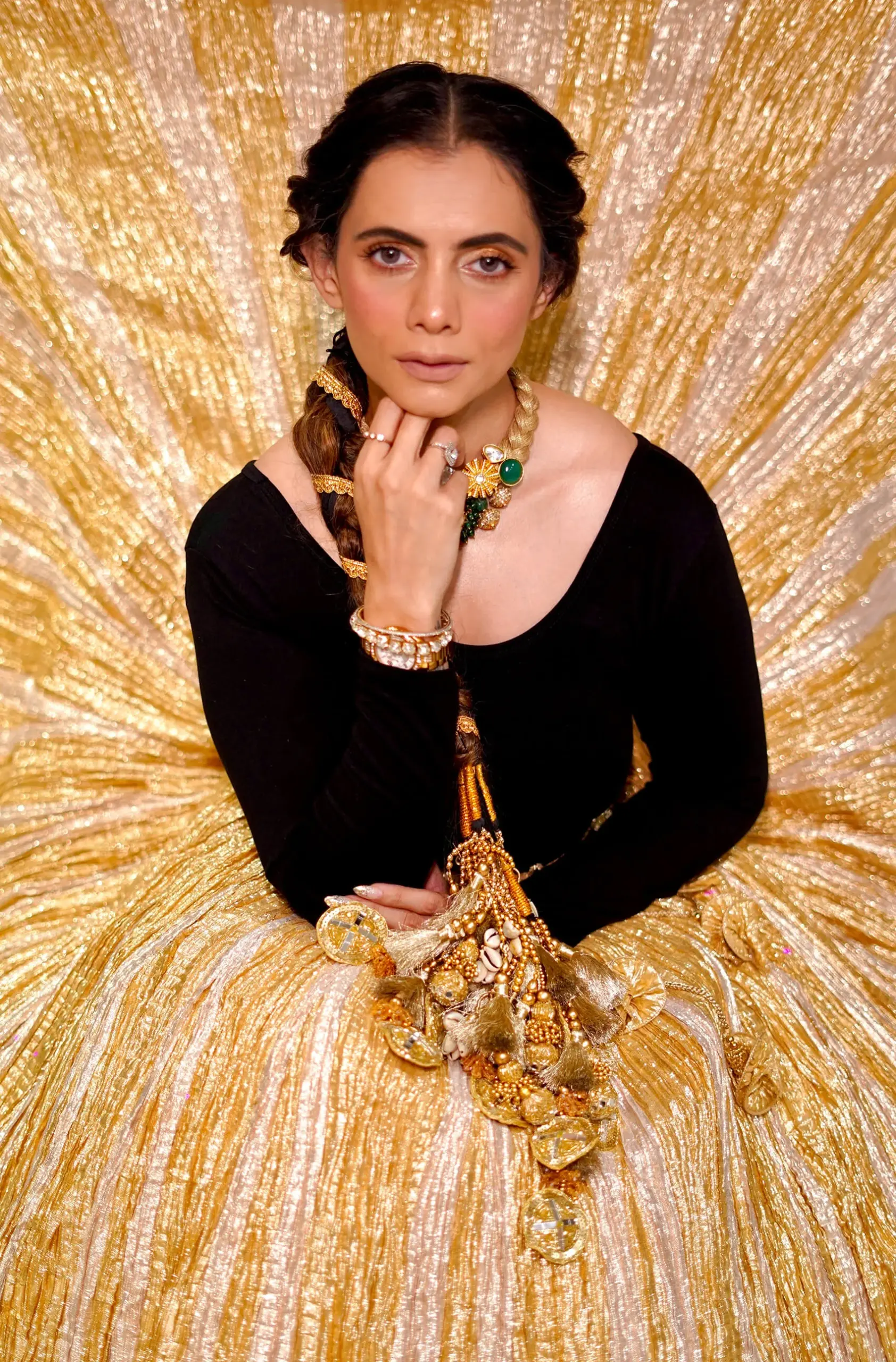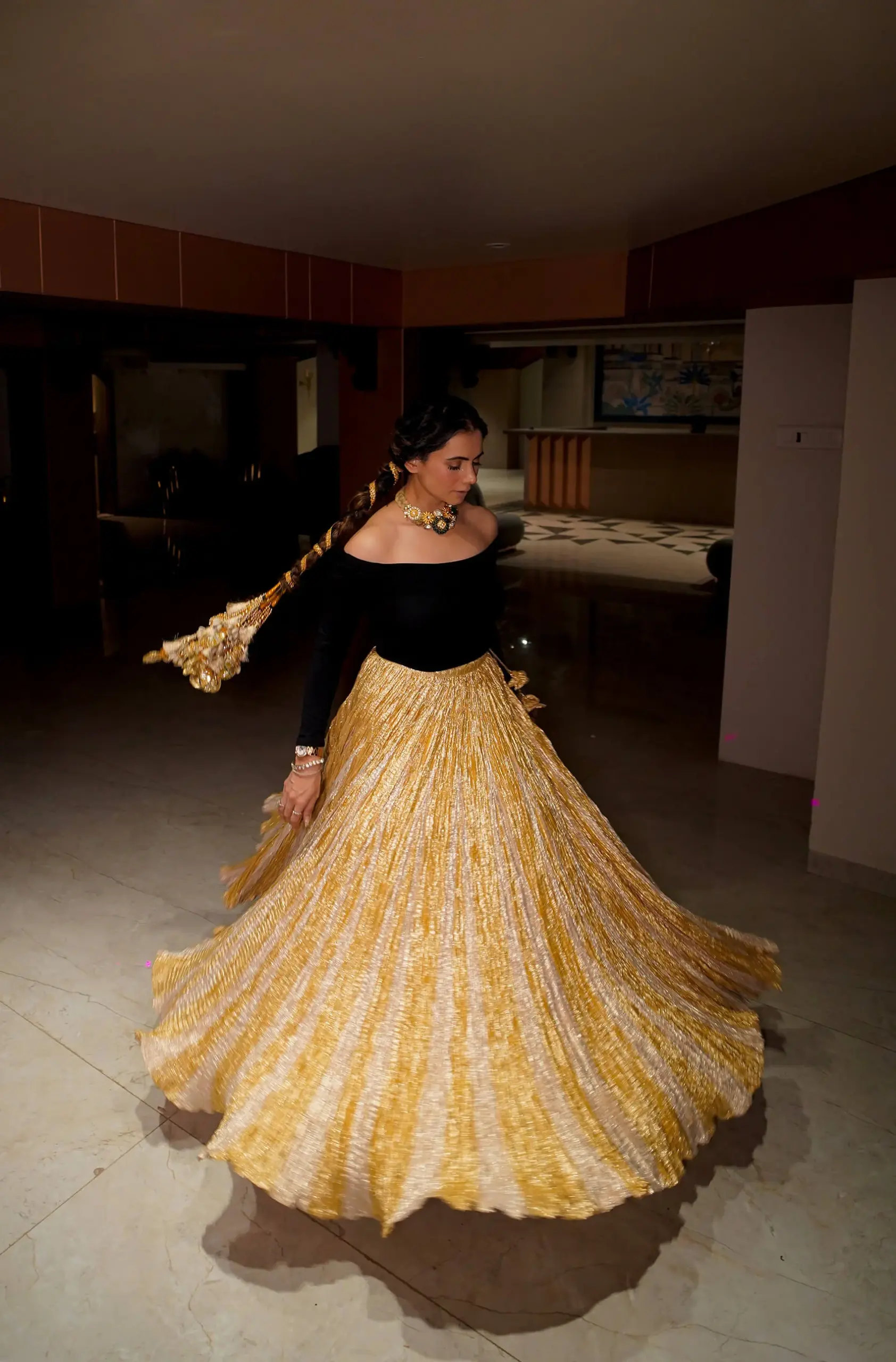 Tanya Kapoor in a textured metallic gold lehenga with a black knitted blouse quantity