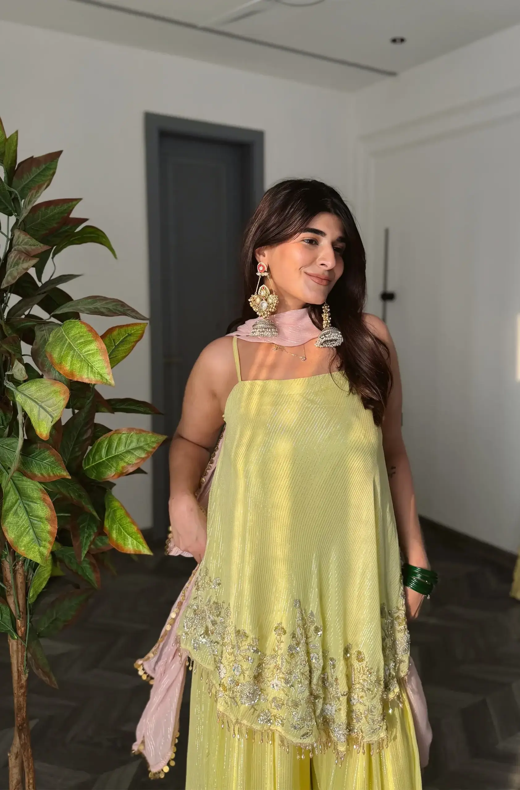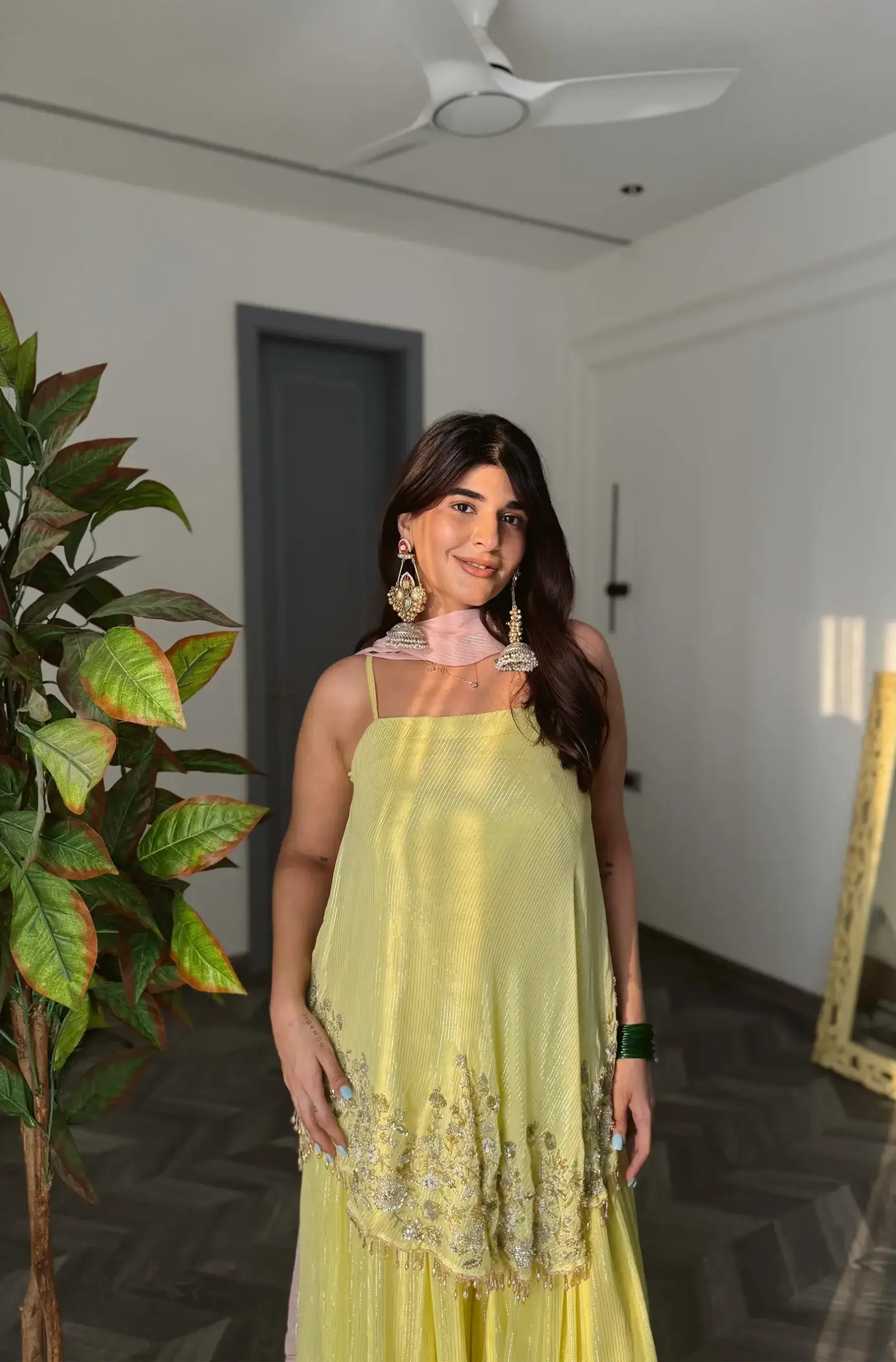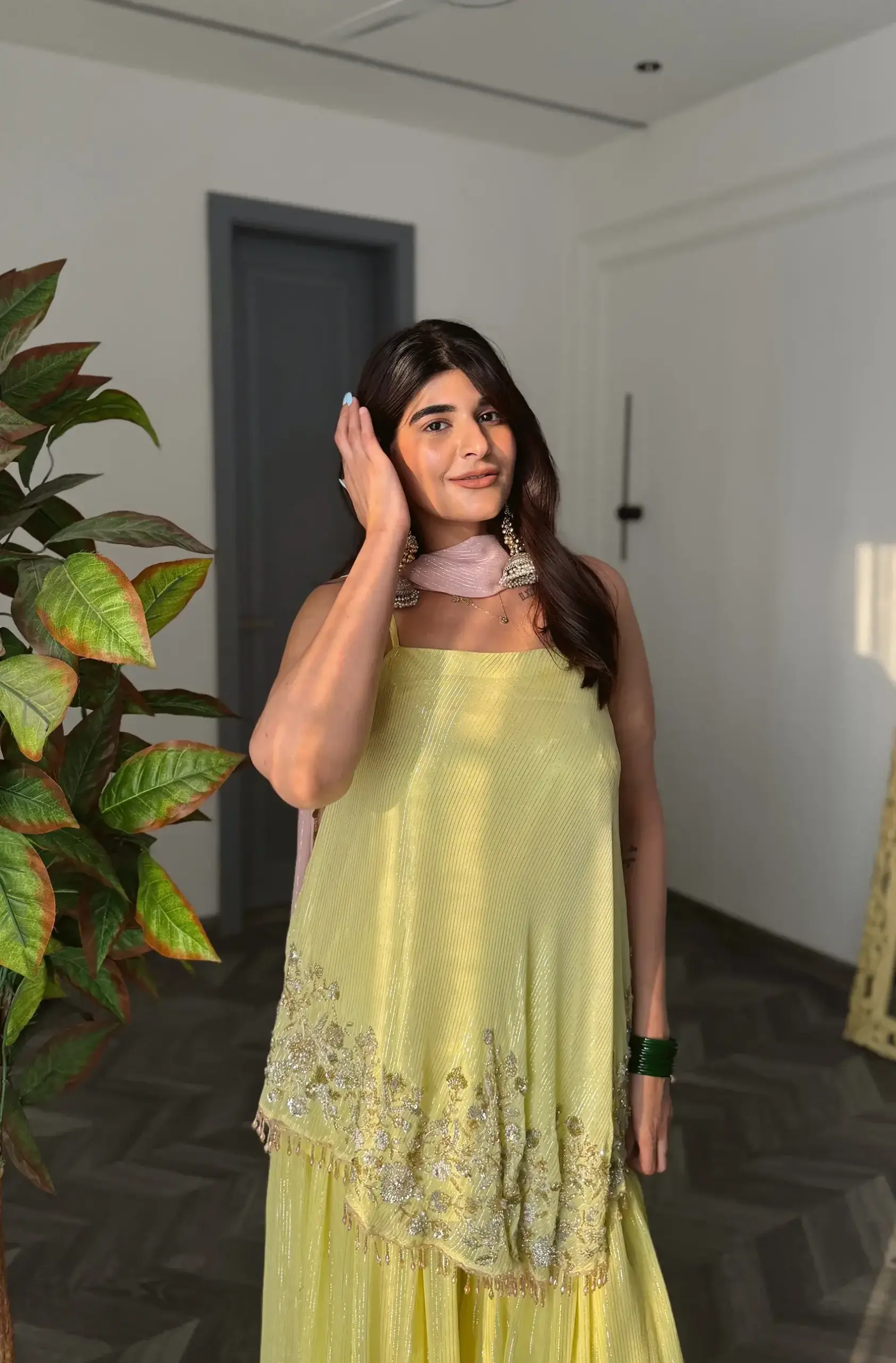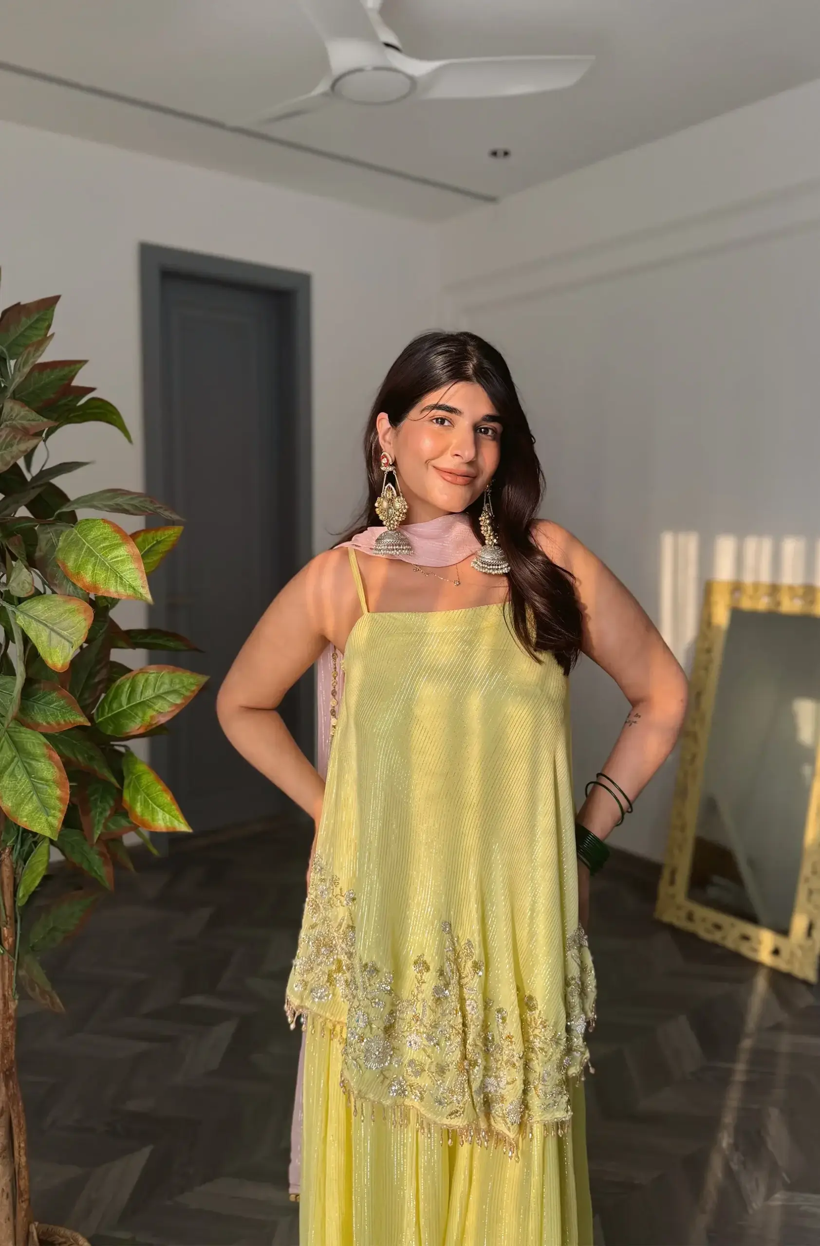 / yellow glass crystals, sequin and zardosi embellished tang top, flared pallazo and a baby pink dupatta